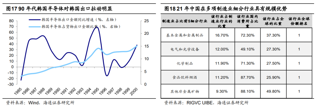 往后看,打造和巩固优势产业是我国形成长期出口核心竞争力的关键。当前我们正处在新一轮科技周期中,全球价值链有望迎来重构,而当前我国在全球价值链中的位置仍有待提升,为了实现价值链地位的赶超,我国就必须抓住与发达国家站在同一起跑线的机遇,在新兴产业领域打造“名片产业”,推动高附加值产业集群的形成。以韩国经验为例,90年代其凭借电子信息产业优势,半导体对出口拉动明显。当前我国在新能源、信息技术部分领域已取得一定优势,我们根据OECD行业分类测算我国在不同行业的出口直接竞争优势,可以发现我国在电气设备、计算机、电子及光学设备已具备极强的直接出口优势。而产业链长板的锻造仍需政策支持,包括创造包容审慎的监管环境、推动产业集群建设等。此外,我国也应积极推动优势产业链出海,比如,当前欧美地区新能源汽车产业缺乏规模化产业链,其发展势必会对我国锂电池及其材料产生新需求,这将给我国新能源企业进入欧洲创造条件,中国新能源产业链体系有望形成更为稳定的供应链体系,为出口的长期韧性打下坚实基础。