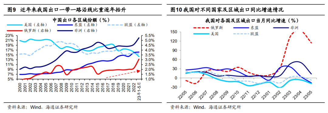 区域视角下一带一路沿线对我国出口韧性的支撑作用正在上升。今年以来我国出口温度明显高于全球贸易环境主要源于我国主导的一带一路国际战略关系推动的出口结构调整,以及新兴经济体与发达经济体的阶段性景气度错位,两者共同带来我国出口表现相对大环境更优。从我国对不同区域的出口份额看,近年来受逆全球化的影响,我国正积极开拓新市场,推动以一带一路为主导的新型国际战略关系建立,这也促使沿线国家成为我国出口拉动的新兴力量。我国出口结构正在发生调整,过去美国和欧盟是我国主要的贸易伙伴,但近年来已出现明显下滑,两者合计占我国出口比重由18年的35.8%降至今年前5个月的29.7%,其中,美国比重同期由19.3%降至14.3%,欧盟同期由16.5%降至15.4%。与此同时,东盟、俄罗斯、非洲等新兴经济体占我国出口份额逐年提升,合计份额同期由19.1%上升至24.5%,其中东盟比重由18年的9.1%提升至23年1-5月的16.2%,非洲同期由4.2%提升至5.3%,俄罗斯同期由1.9%提升至3.1%。