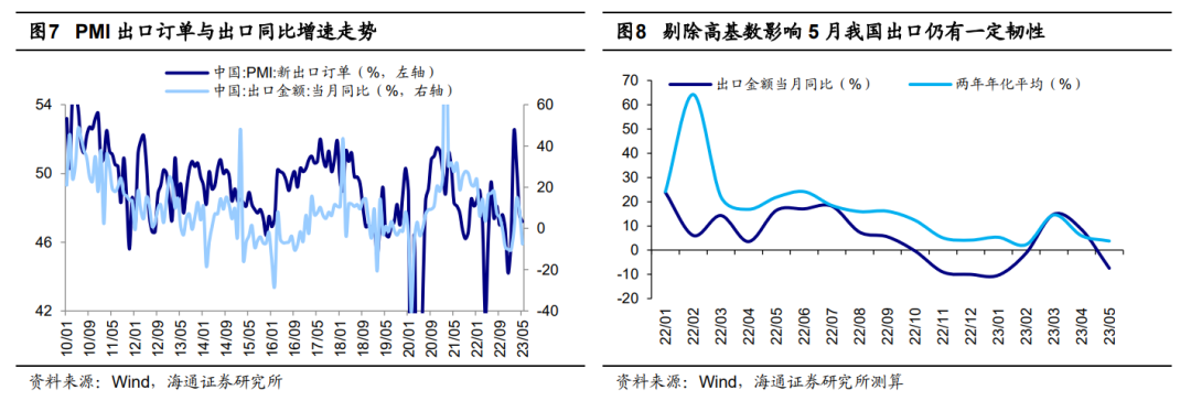 在严峻的贸易形势下,今年我国出口数据相比而言较好。受外贸环境降温的影响,与我国出口产品大类结构类似的韩国、越南出口持续低迷,但我国出口在外需降温的压力下整体经受住了考验,展现出了不同于其他出口国家的韧性,1-5月我国出口金额累计同比增速为0.3%,明显高于韩国(1-5月累计同比为-13.5%)、越南(-11.6%)。从出口的走势看,我国出口增速在今年3-4月一度实现逆势转正,其中3月我国出口增速更是大超Wind一致预期的-5.0%,实现了14.8%的高增长。尽管5月我国出口增速已由正转负,同比增速为-7.5%,但主要受到了高基数的影响,去年同期受疫情政策逐步优化影响,5-7月出口增速明显抬升,如果剔除高基数影响,从两年年化平均来看,5月出口增速依然有3.8%。