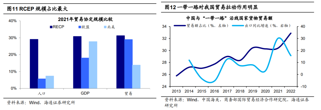 另一方面,积极开拓新市场,推动以我国为主导的一带一路新型国家关系建立。自13年一带一路提出以来,我国“一带一路”沿线国家持续扩大,我国与沿线国家的货物出口贸易额由13年的0.57 万亿美元增长至22年的1.72 万亿美元,年复合增长率为8.4%,远高于同期我国整体货物贸易出口额复合增长率为5.6%。中国对沿线国家和地区进出口占中国外贸整体的比重从13年的25%显著提升到22年的32.9%,沿线国家已成为我国出口的新增长点。产业转移是一带一路建设的重要内容,是开展双边产业合作和互惠共生的重要载体,未来我国应积极助力中国企业“走出去”,为我国企业在海外建厂提供便利和支持,发挥投资积聚化效应,在当地做好产业链配套。