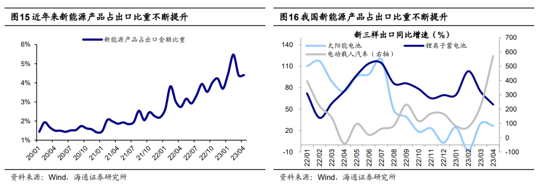 结合需求侧看,当前海外需求支撑下新能源产品出口有望保持高增,或成为我国出口的全年结构性亮点。当前海外能源转型需求仍高,且受宏观经济影响较小,因此有望支撑新能源产业链出口保持高增。以新能源车为例,新能源车出海有望成为今年重要的增量,根据乘联会秘书长预测,今年我国汽车出口有望达到400万辆。综合来看,在海外需求支撑下,我国优势产业出口或迎来机遇,新能源产品已成为当前出口的结构性亮点,今年以来“新三样”(电动载人汽车、锂电、太阳能电池)出口保持高增,23年1-4月“新三样”拉动我国出口整体增长2.2个百分点。