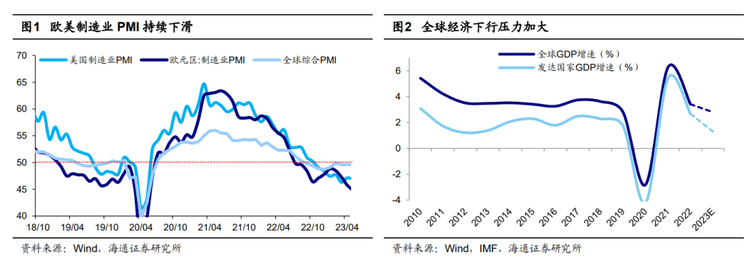 今年以来国际贸易环境整体处在“冬天”。我们常用发达经济体景气度、航运情况等指标来刻画当前外贸环境的温度,今年以来相关指标均显示外部贸易环境正在持续恶化,各国出口形势均面临严峻的考验。从全球经济景气度来看,当前以发达经济体为代表的海外需求疲软,经济下行压力加大。根据最新IMF预测,今年全球经济增速将放缓,其中发达经济体的增速放缓或尤为明显,预计23年经济增速仅为1.3%。从PMI数据看,5月全球制造业PMI为49.6%,保持在荣枯线以下,其中欧盟PMI由今年年初的高点48.8%回落至44.8%、美国由高点47.7%回落至46.9%,主要发达经济体经济景气度维持下行态势。