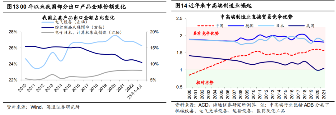 从我国出口产业结构来看,00年以来我国中高端制造业的出口显性比较优势(我国中高端制造业出口增加值占总出口增加值的份额与世界出口增加值中该行业出口增加值所占份额的比值)不断提升,由00年的0.8(处在相对劣势水平)提升至21年的1.6(处相对优势)。若我们进一步看我国主要产品的出口份额的变化,过去我国在劳动密集型产品中的份额占比正在下降,例如中低端制造中纺织制品由18年的10.7%降至22年的8.9%,而随着我国产业结构升级,中高端制造产品中电子、计算机集成制造产品由6.5%上升至8.1%。当前我国中高端制造已逐渐崛起,尤其是在以新能源为代表的新兴产业领域,我国已取得一定技术和规模优势,20年以来我国新能源产品出口占总出口比重由1%上升至当前5%左右。以动力电池为例,22年宁德时代在市场份额达到37.1%,为全球第一,新能源产业已在全球领先。