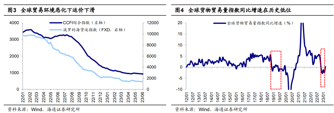 在外需整体走弱的背景下,全球贸易受到显著影响。今年以来全球货物贸易量指数同比增速在低位徘徊,最低同比增速跌至-2.5%,若不考虑20年受疫情影响的时期,已经低于自金融危机以来的低点(18年中美贸易摩擦下全球贸易迅速降温,全球货物贸易量指数同比增速最低达-1.9%),可见全球贸易环境温度已低。从航运情况来看,海运热度受全球贸易景气度影响较大,截至2023/06/09,波罗的海货运指数(FDX)年初以来跌幅达到50%,反映全球海运市场受贸易需求恶化影响降温明显,中国出口集装箱运价年初以来跌幅也达38%,其中欧洲、美东航线降幅较大,分别为55%、61%。