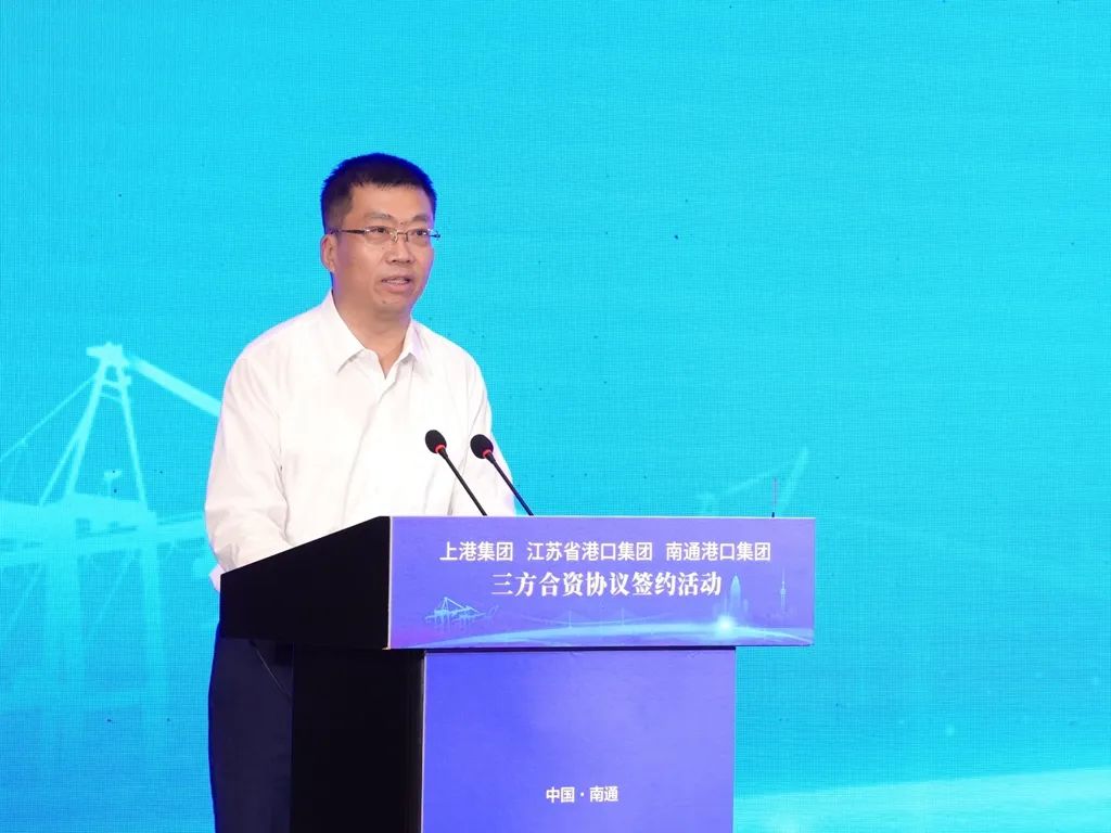 上港集团党委副书记、总裁严俊,江苏省港口集团党委副书记、总经理关永健,南通市委副书记、市长吴新明致辞并见签。