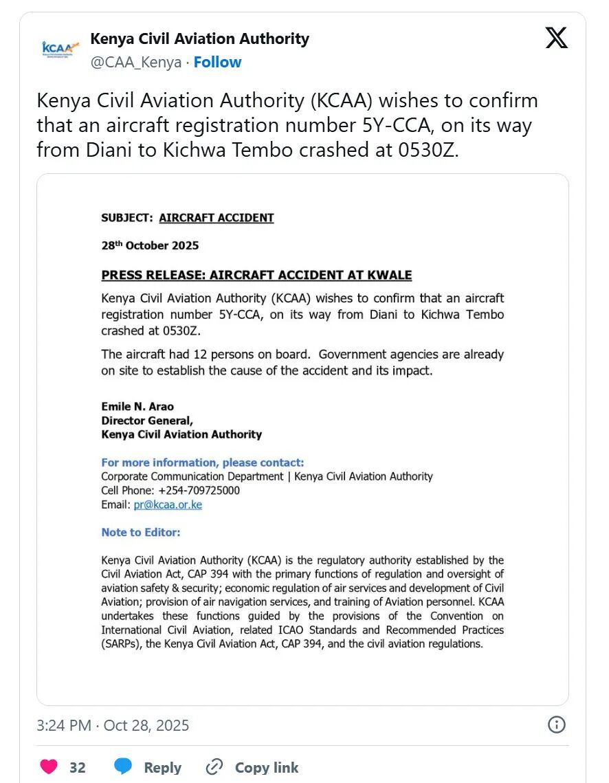 在10月28日发布的题为“航空事故”的新闻稿中,KCAA确认:“注册号为5Y-CCA的飞机在从迪亚尼飞往基丘瓦滕博途中,于协调世界时05:30坠毁。机上共载有12人。政府机构已抵达现场调查事故原因及影响。”