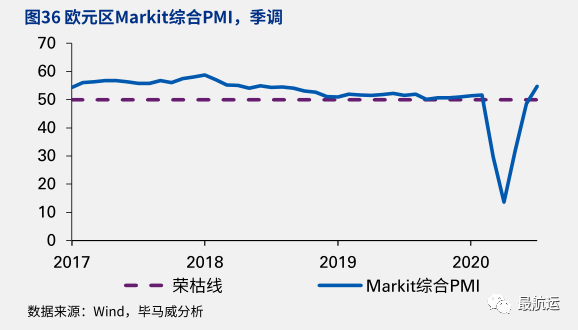 与此同时,欧洲航线本周也小幅上涨,北欧上涨1%多达到937美元/TEU,地中海港口上涨2.3%达到996美元/TEU。一些高频数据显示欧元区经济正在逐步恢复过程中,如:德国零售销售额季调环比5月转正为13.4%,较4月提升近20个百分点,工业生产指数也小幅回升,季调环比从4月的-20%,提升至5月的9.7%。法国、意大利亦有相同修复趋势。此外,欧元区Markit综合PMI指数在7月达到54.8,制造业54,服务业55.1,均创下近两年内新高。随着生产经营活动日渐正常,居民恢复就业,前期积压的消费需求正在逐步释放,企业对未来经济修复形势看好。