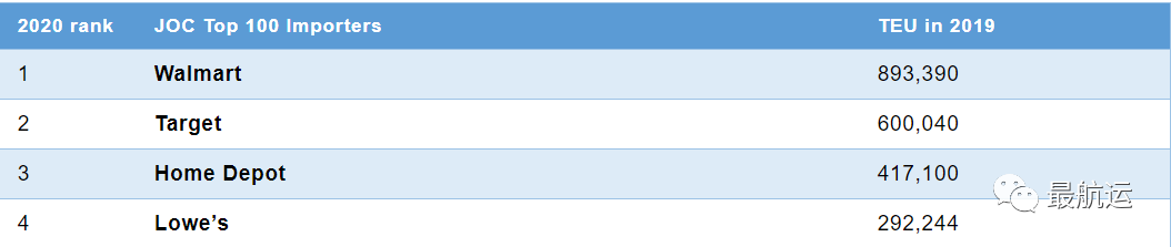 根据最新2019年度美国买家收货人进口货量100强!货代外贸人必看收藏! Walmart, Target, Home Depot, Lowe\'s在中国的采购量常年占据前四,最航运一直在监测这四家需求端的订单变化。