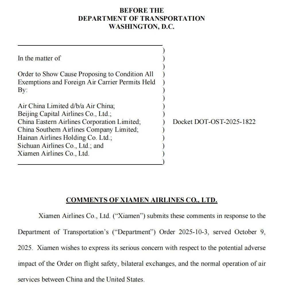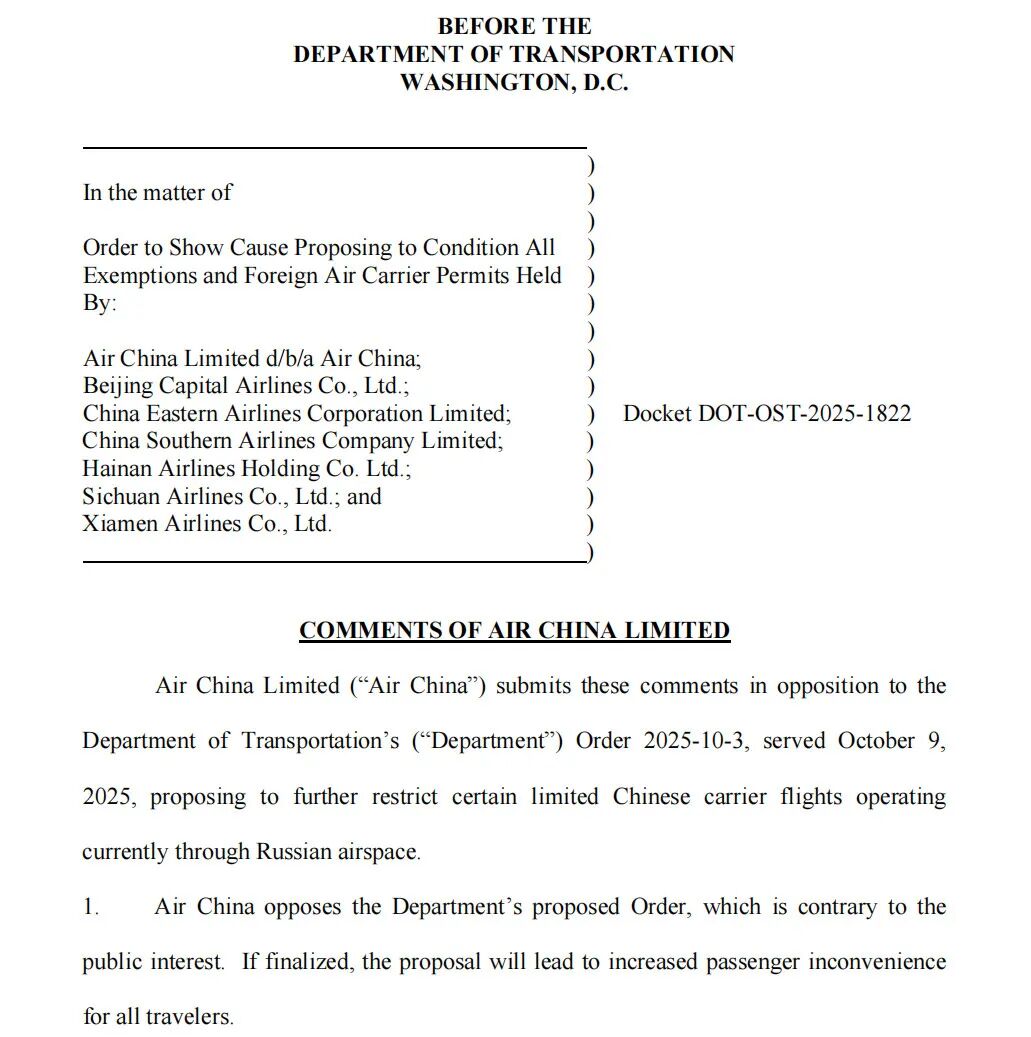 国航指出,这一命令违背公众利益,将给旅客带来更多不便。国航估计,如果该命令生效,至少将有4400名已购买2025年11月和12月国航机票的旅客受到影响。如果美国交通部继续推动这一限制,国航请求给予60天宽限期。
