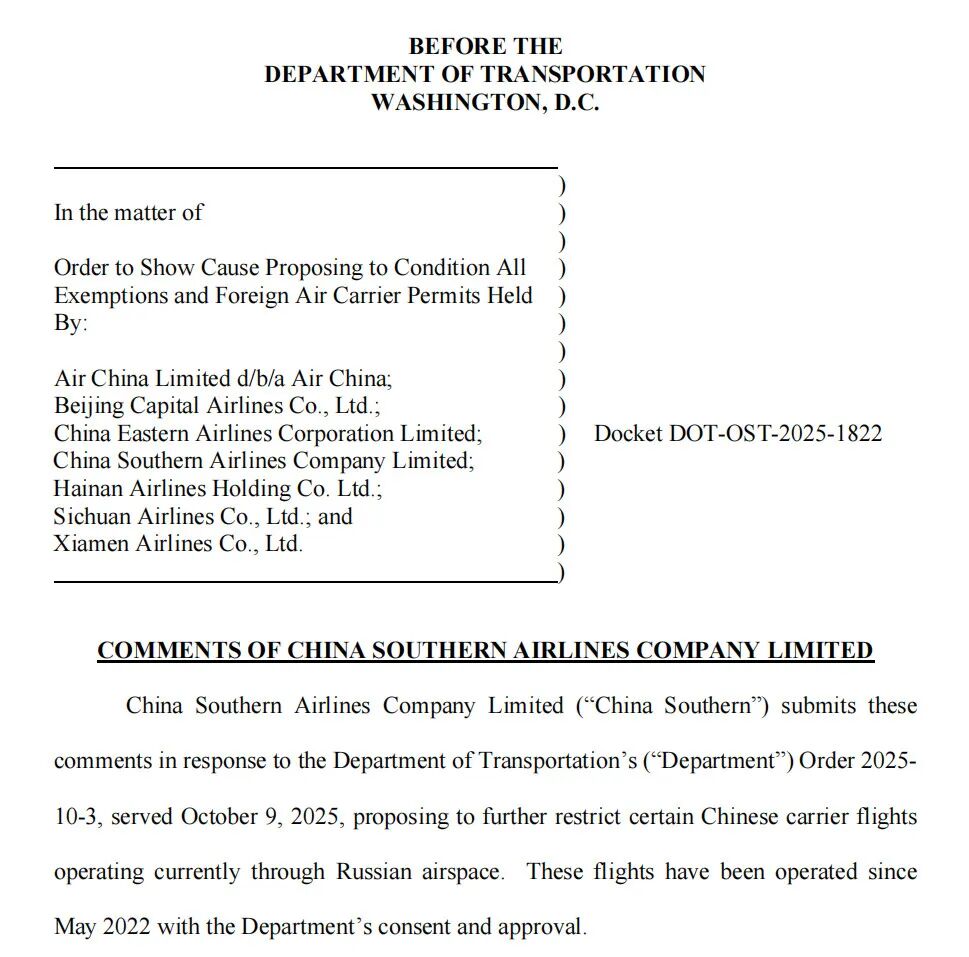 据美国政府法规公示网站Regulations.gov显示的最新信息,针对美国交通部(DOT)此前提议禁止中国航司在执行往返美国航班时飞越俄罗斯领空,并要求中国航司在两个工作日内给予答复的命令,目前国航、东航、南航、海航、厦航和川航均已提交各自答复。