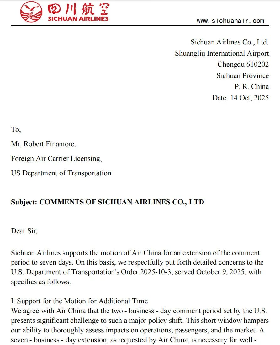 川航同样对国航关于延长答复期的动议表示了支持,并基于市场干扰、对公众利益损害、运营安全、经济与环境冲击、已购机票旅客影响等,在多个方面表示了关切,并请求美国交通部给予重新考虑。