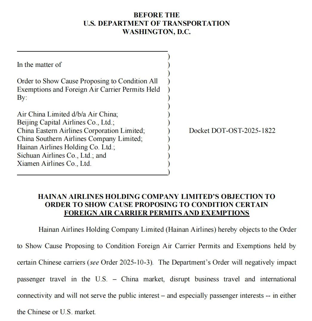 海航指出,这一命令将使得美国东海岸与中国之间本已具有挑战性的航空旅行市场状况进一步恶化,严重限制美国东海岸与中国之间的航空旅行机会与连通性,并且不符合公众利益。