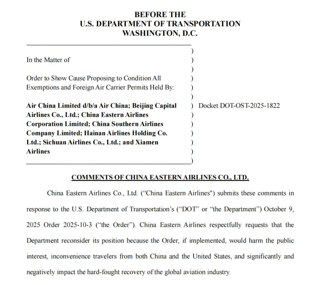 值得一提的是,东航在答复中明确引用了《中美民用航空运输协定》第16条的具体文本:“任何一方均可随时就本协议提出协商请求。此类磋商应尽早开始,最迟不得晚于另一方收到请求后的六十(60)天,除非双方另有约定”。通过援引这一条款,东航指出美国交通部“单方面行动,通知和评论期极短”,因此“此法案毫无公平性可言”。