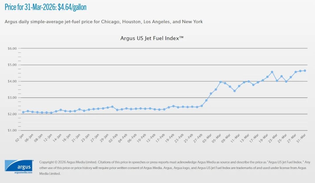 3月17日,达美航空CEO埃德·巴斯蒂安(Ed Bastian)表示,航空燃油价格“自年初以来已几乎翻了一番”,仅在3月份,这一涨幅就导致达美的燃油账单额外增加了数亿美元。