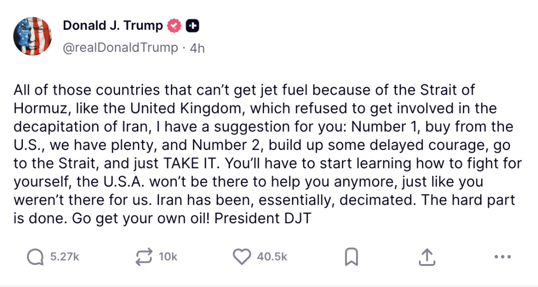 在其发布于社交平台“Truth Social”的帖文中,特朗普称,像英国这样的国家“因为霍尔木兹海峡的问题而无法获取航空燃油”。特朗普直接告诉它们:“自己去弄你们的石油吧。”