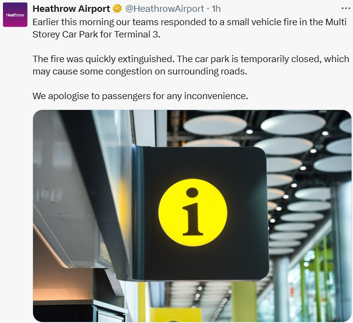 希思罗机场表示,1日早上3号航站楼的多层停车场内一辆汽车起火,机场迅速做出响应,大火很快被扑灭。该停车场暂时关闭,可能会导致周边道路拥堵。我们对由此给旅客带来的不便表示歉意。